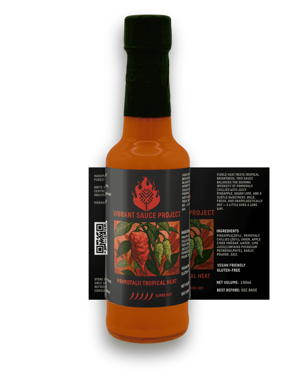 Fierce heat meets tropical brightness. This sauce balances the searing intensity of primotalii chillies with juicy pineapple, sharp lime, and a subtle sweetness. Bold, fresh, and unapologetically hot — a little goes a long way. Gluten free. Vegan friendly